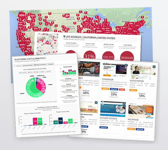 The data and reports include global, country and city level information, counts the number of campaigns, backers, the amounts of money raised, the activity of each platform and more.